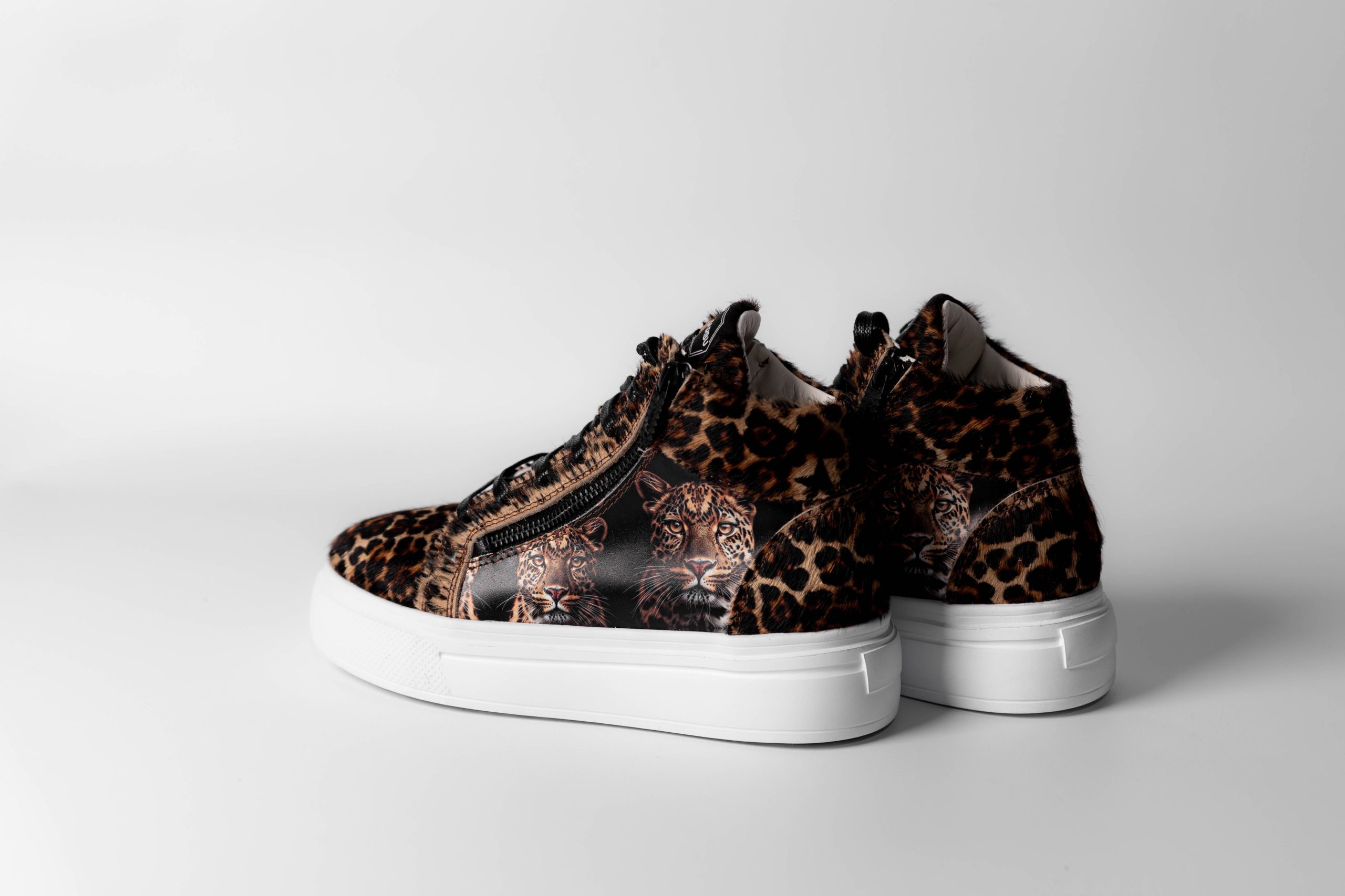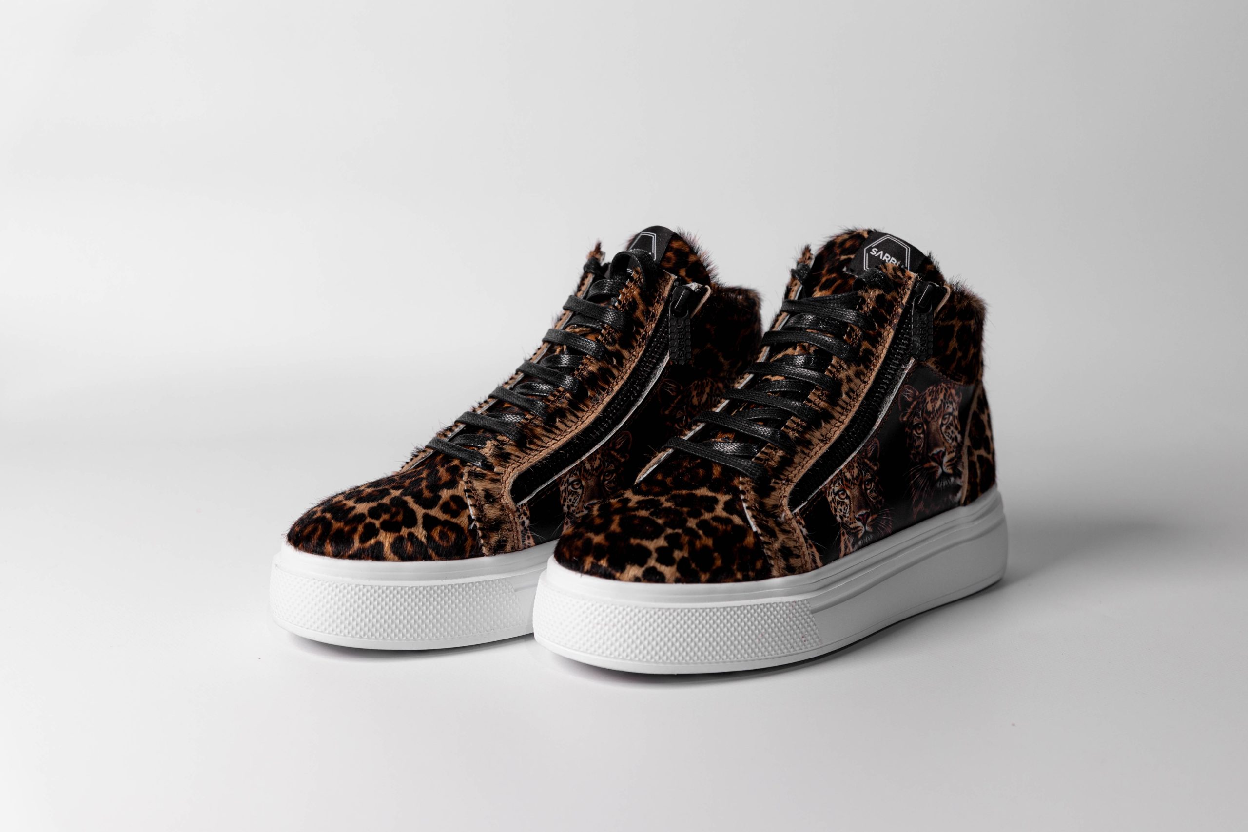 High-top sports sneakers. Made of pony and plain leather, accessorized with print.