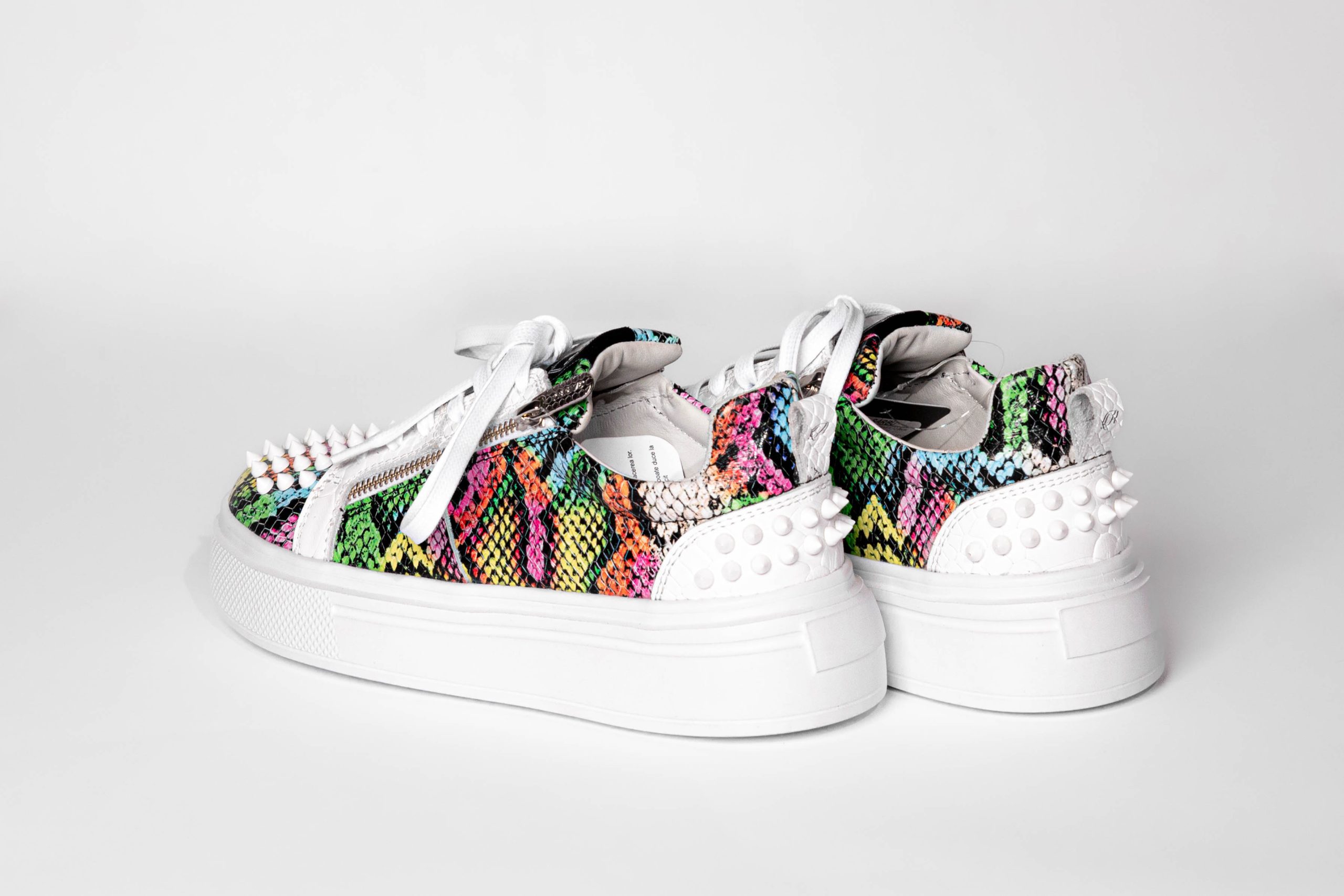Low sports sneakers. Combination of colourful snake texture and white croc.