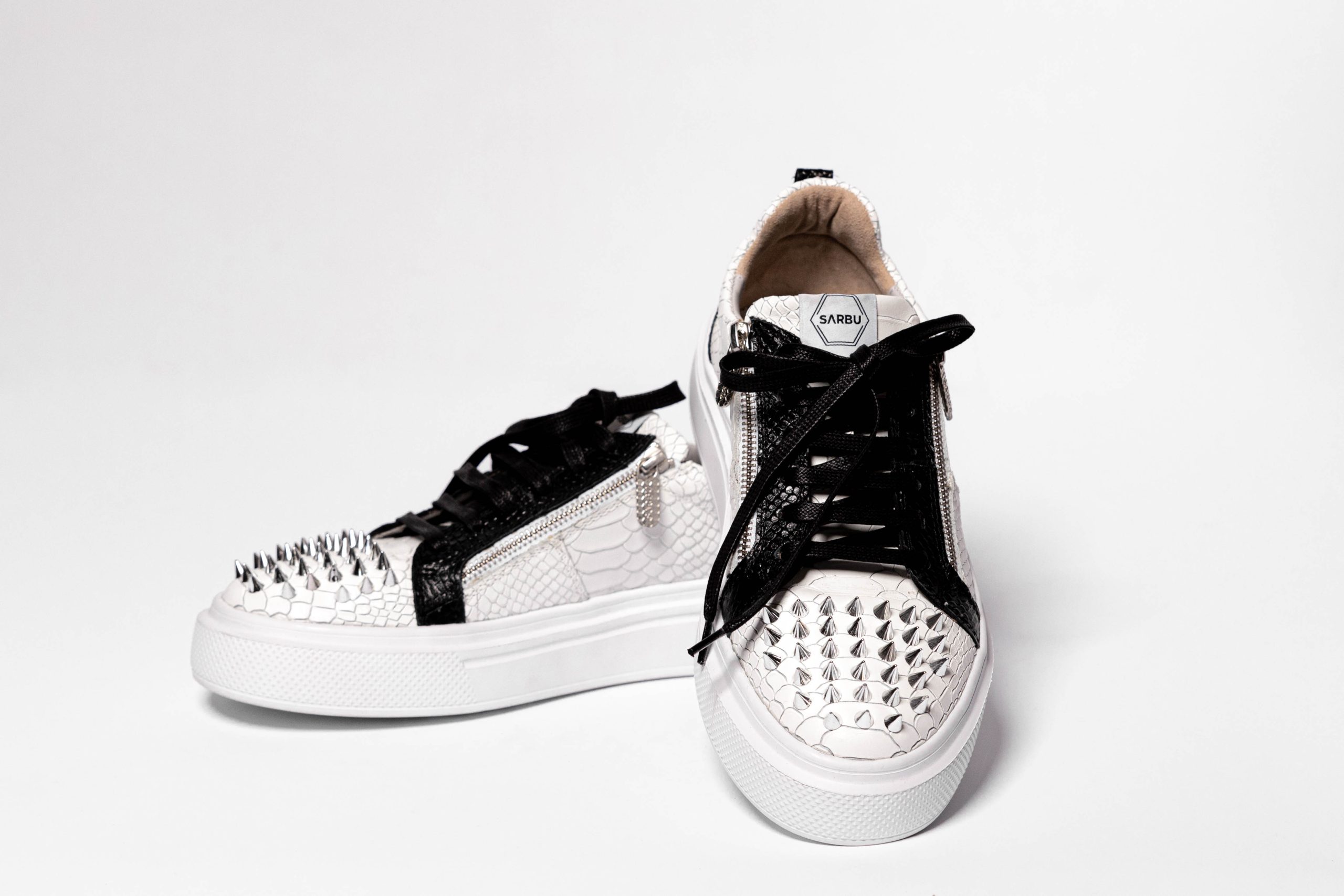 Made of leather with a black and white python texture.