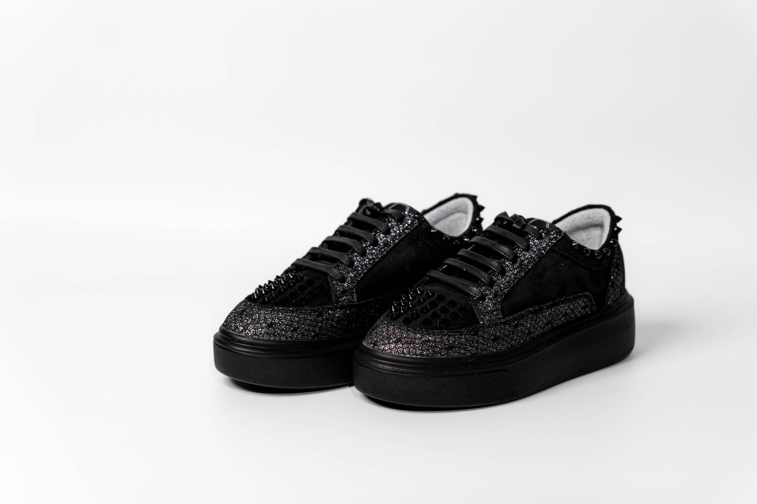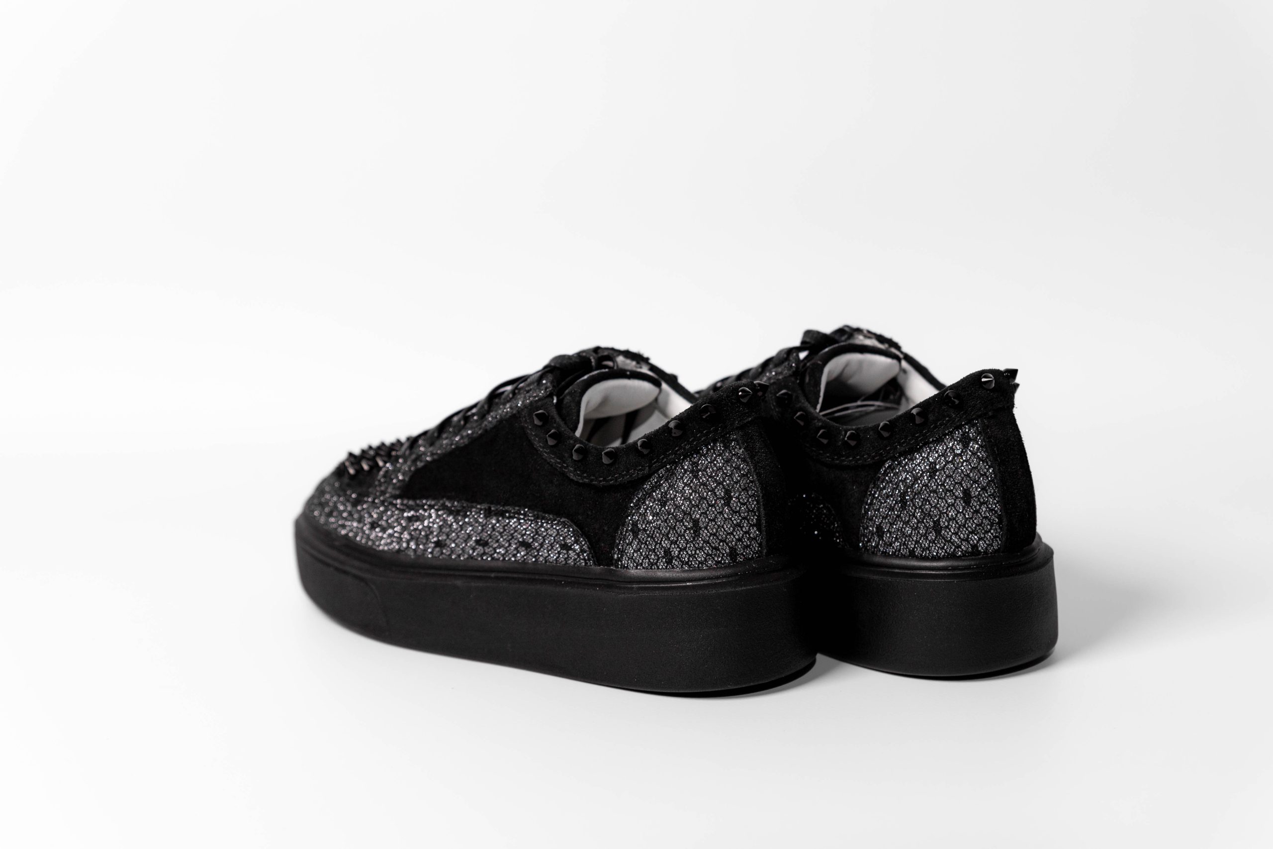 Low sports sneakers. Combination of black suede and glitter fabric. Accessorized with black studs.