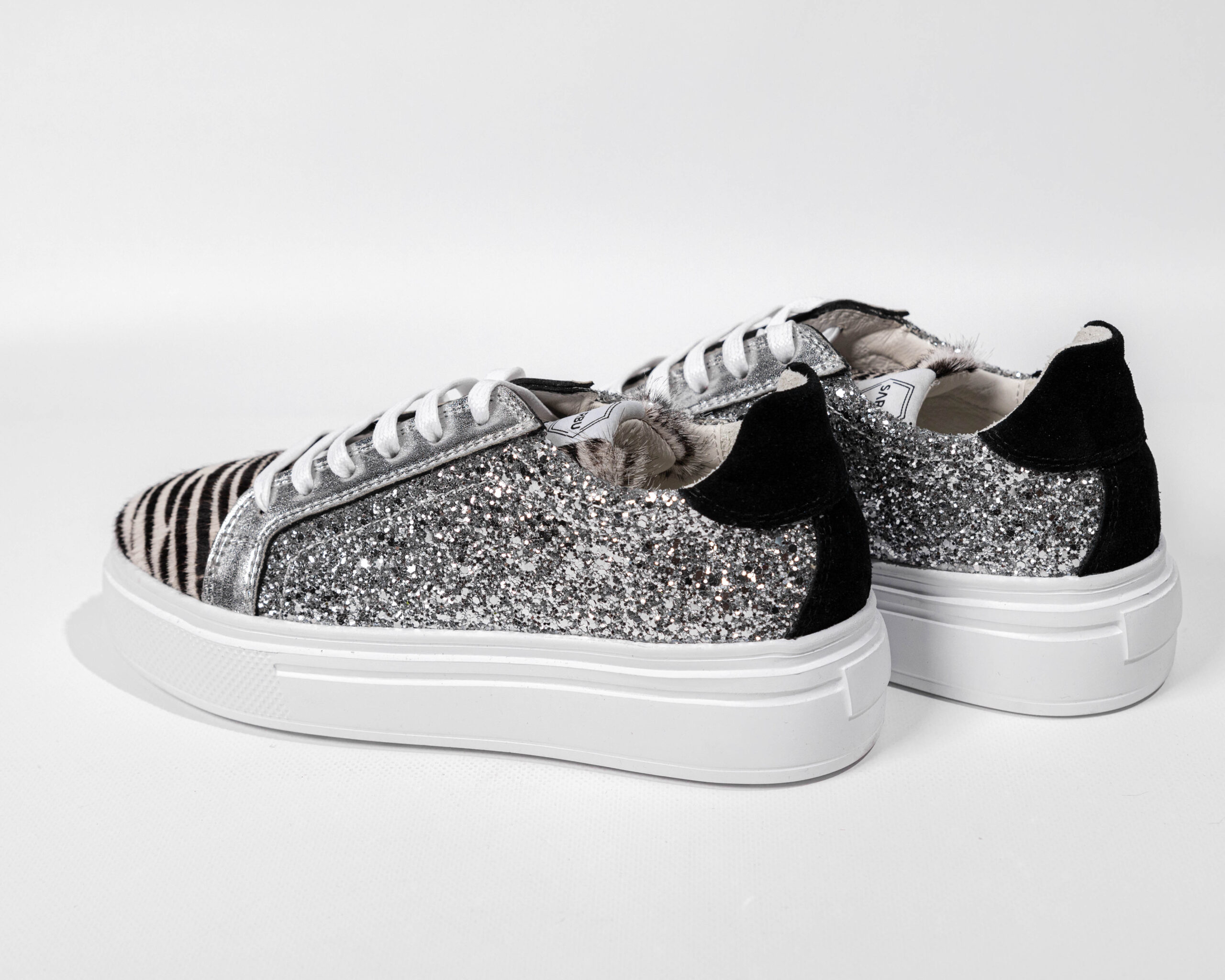 Sneakers sportive basse. Realizzate con un mix di texture: cavallino, glitter, pelle scamosciata e pelle liscia. Chiusura con lacci. Altezza della suola: 4-4,5 cm, 100% EVA.